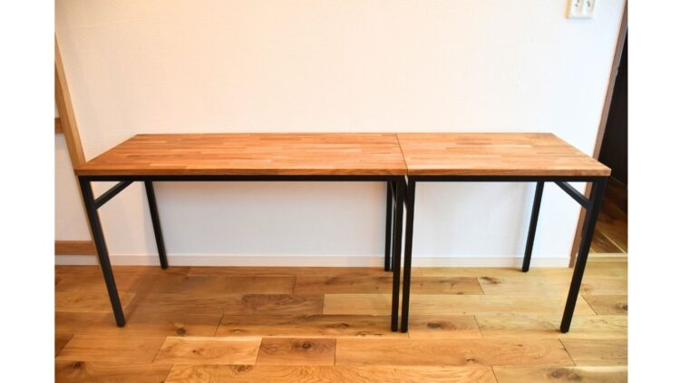 ロフト下には、幅500mmと700mm・高さ720mmのアイアン脚デスクをそれぞれ1台ずつ、L型に配置。